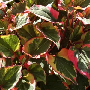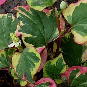 L’Houttuynia se distingue par son feuillage en forme de cœur, vert vif ou panaché selon les variétés. La plus populaire, ‘Chameleon’, offre un spectacle unique avec ses feuilles tricolores mêlant vert, crème, jaune, orange et rouge, surtout si elle reçoit suffisamment de lumière. En exposition ensoleillée, la coloration est plus intense, tandis qu’à l’ombre, le feuillage reste plus sobre, mais la plante conserve toute sa vigueur. Le feuillage est aromatique, dégageant une odeur caractéristique, et il est comestible : il apporte une note poivrée et fraîche aux salades ou à certaines recettes asiatiques.