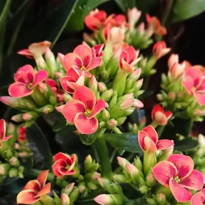 Le kalanchoé est surtout apprécié pour ses fleurs, regroupées en grappes ou en corymbes au sommet des tiges. Les couleurs sont vives et variées : rouge, rose, orange, jaune, blanc, violet, parfois bicolores selon les cultivars. La floraison, qui peut durer de 2 à 3 mois, intervient principalement au printemps, mais certaines variétés, comme le très populaire Kalanchoé de Blossfeld (Kalanchoe blossfeldiana), sont proposées en fleurs toute l’année chez les fleuristes. Les fleurs, petites et tubulaires, sont souvent doubles chez les variétés horticoles récentes, offrant des bouquets denses et ronds.