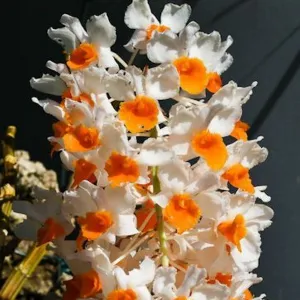 Le Dendrobium se distingue par ses longues tiges appelées « cannes » ou pseudobulbes, dressées ou légèrement retombantes, qui peuvent atteindre 60 à 80 cm de hauteur à maturité. Les feuilles, persistantes, vertes et coriaces, sont disposées le long des cannes, tombant après deux ans pour laisser place à de nouvelles pousses. La floraison, qui s’étend de la fin de l’hiver au printemps, est particulièrement abondante : les fleurs, de 4 à 7 cm de diamètre, apparaissent en grappes le long des tiges, offrant une palette de couleurs allant du blanc pur au rose, jaune, violet ou bicolore, parfois bordées de touches de vert. Un grand spécimen peut porter jusqu’à 200 fleurs simultanément.