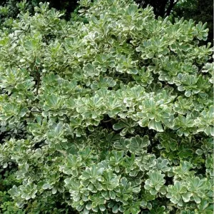 Le principal atout du pittosporum réside dans son feuillage persistant, dense et ornemental. Les feuilles, coriaces, lustrées et souvent aromatiques, varient du vert foncé brillant au gris-vert panaché de crème, de blanc ou de rose selon les variétés. Certaines, comme ‘Irène Patterson’ ou ‘Elisabeth’, offrent des panachures lumineuses qui apportent du contraste dans les massifs ou les haies. Le feuillage, parfois légèrement ondulé ou marginé, reste attractif même en hiver, assurant une structure permanente au jardin.
