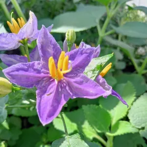 De juin à octobre, le Solanum moyen se couvre d’une multitude de petites fleurs étoilées, violet clair à bleu violacé, au cœur jaune éclatant. Ces fleurs, en forme de trompette ou d’étoile, sont regroupées en grappes à l’extrémité des rameaux, offrant un spectacle lumineux et continu tout l’été et jusqu’aux premières gelées. Cette floraison attire de nombreux insectes pollinisateurs, contribuant à la biodiversité du jardin.