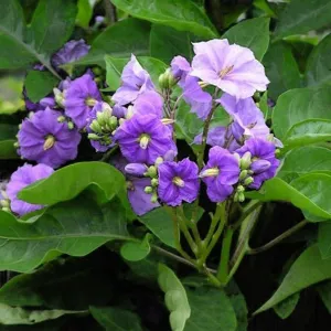 Le Solanum petit forme un buisson dense et arrondi, ne dépassant pas 30 à 45 cm de hauteur à maturité. Ses tiges ramifiées portent un feuillage persistant, vert foncé, lustré et légèrement ondulé, qui reste décoratif toute l’année. Cette silhouette compacte et structurée en fait un choix idéal pour les rebords de fenêtre, les tables de balcon ou les compositions de plantes en pot.